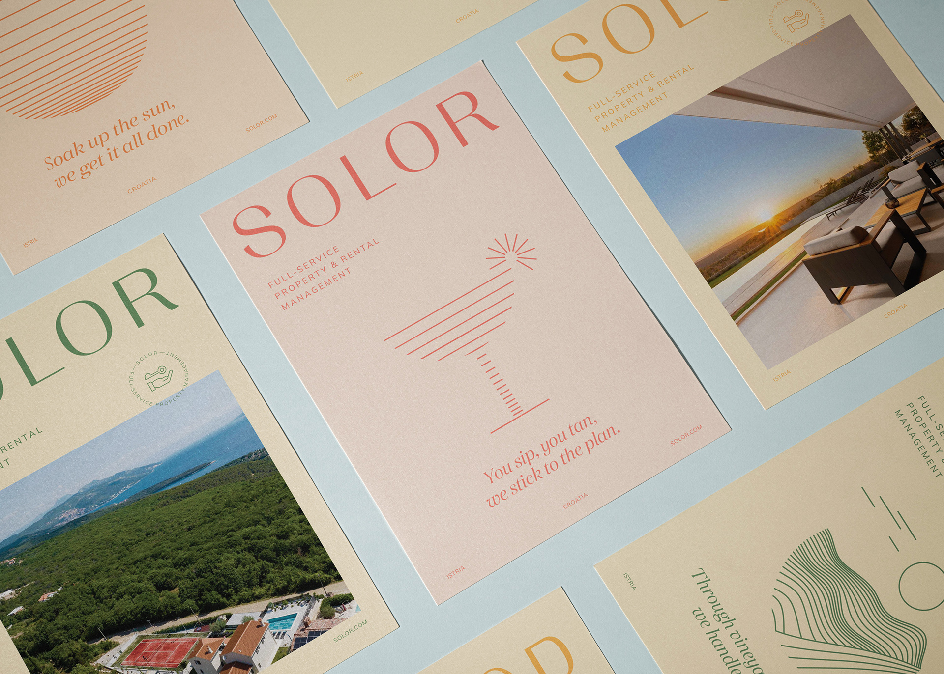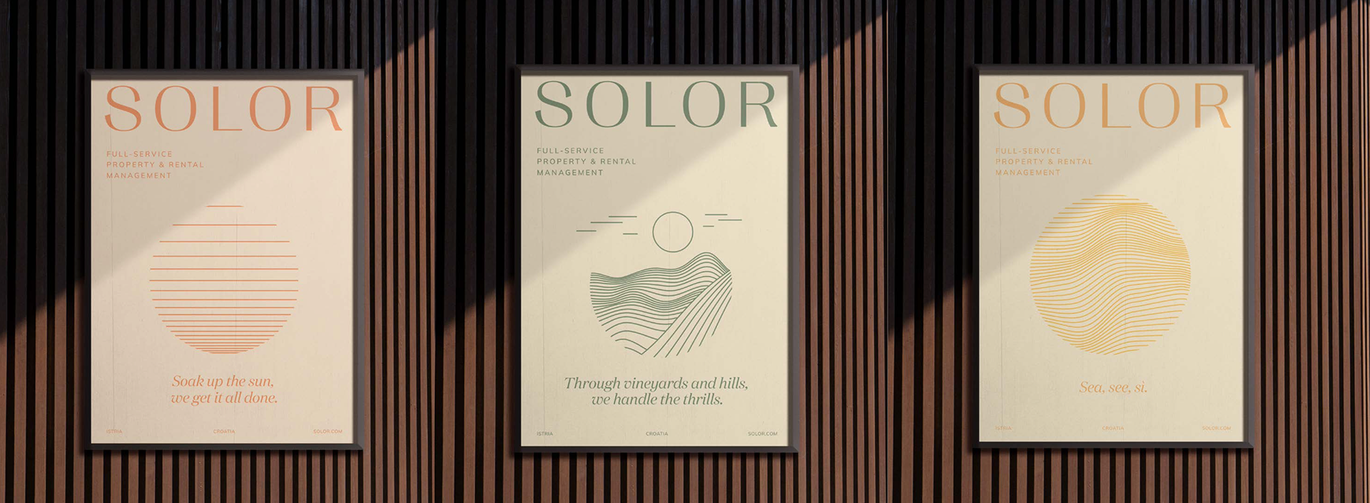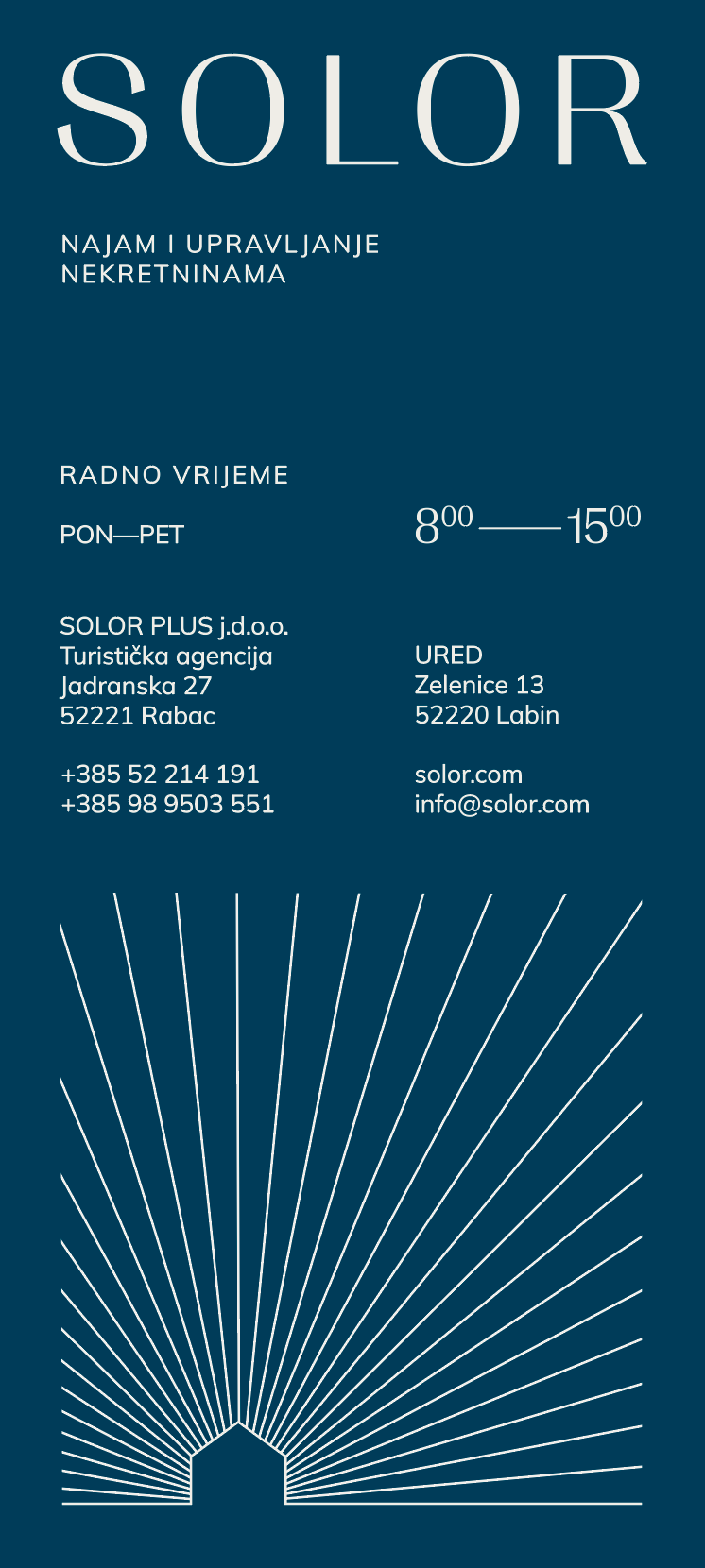vizualni identitet + brending SOLOR kao full-service agencija za najam i upravljanje luksuznim nekretninama, koja vlasnicima pruža cjelovito rješenje ključ u ruke, dok gostima nudi mnoštvo izbora i besprijekorno iskustvo odmora prilagođeno osobnim potrebama i željama. Strategija komunikacije temelji se na kreativnom i jasnom obraćanju dvjema ključnim publikama – vlasnicima i gostima.