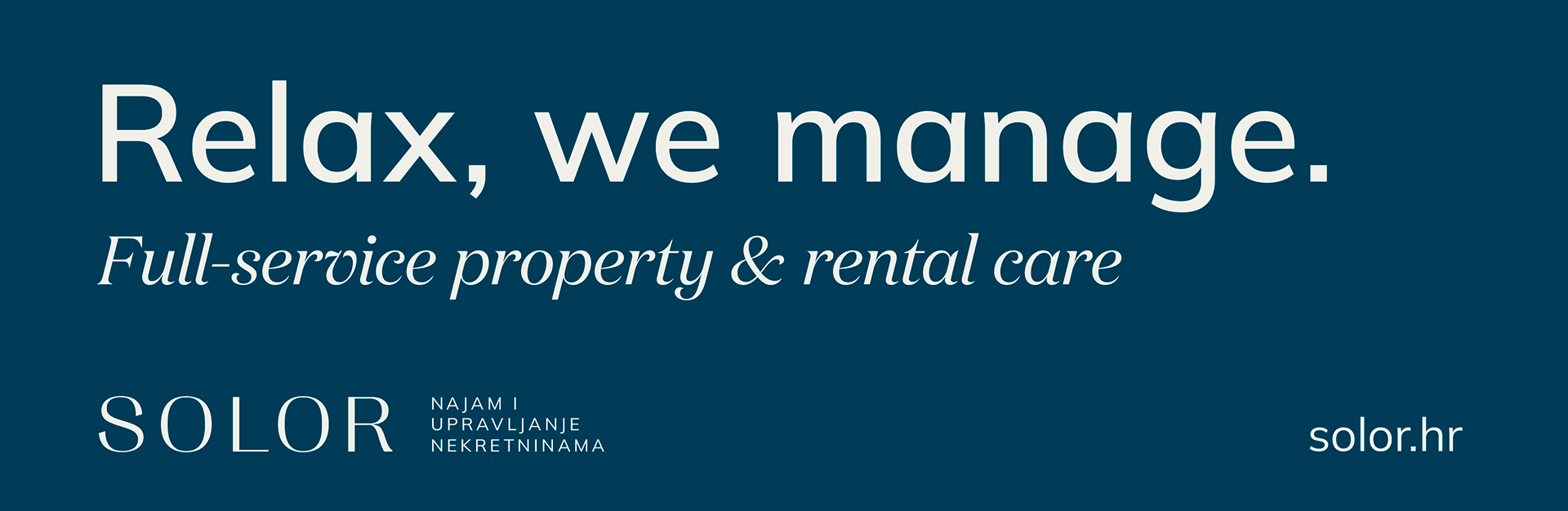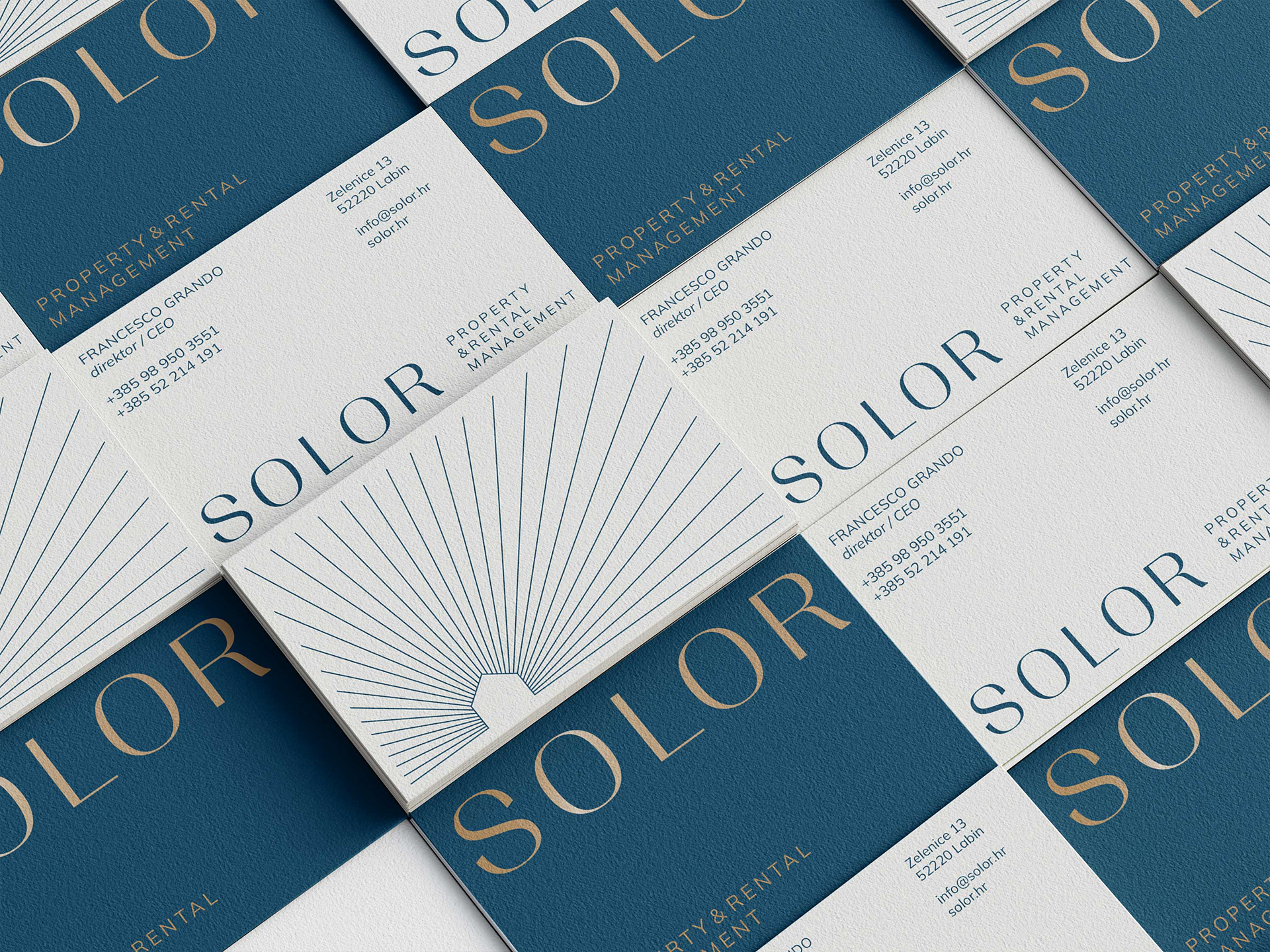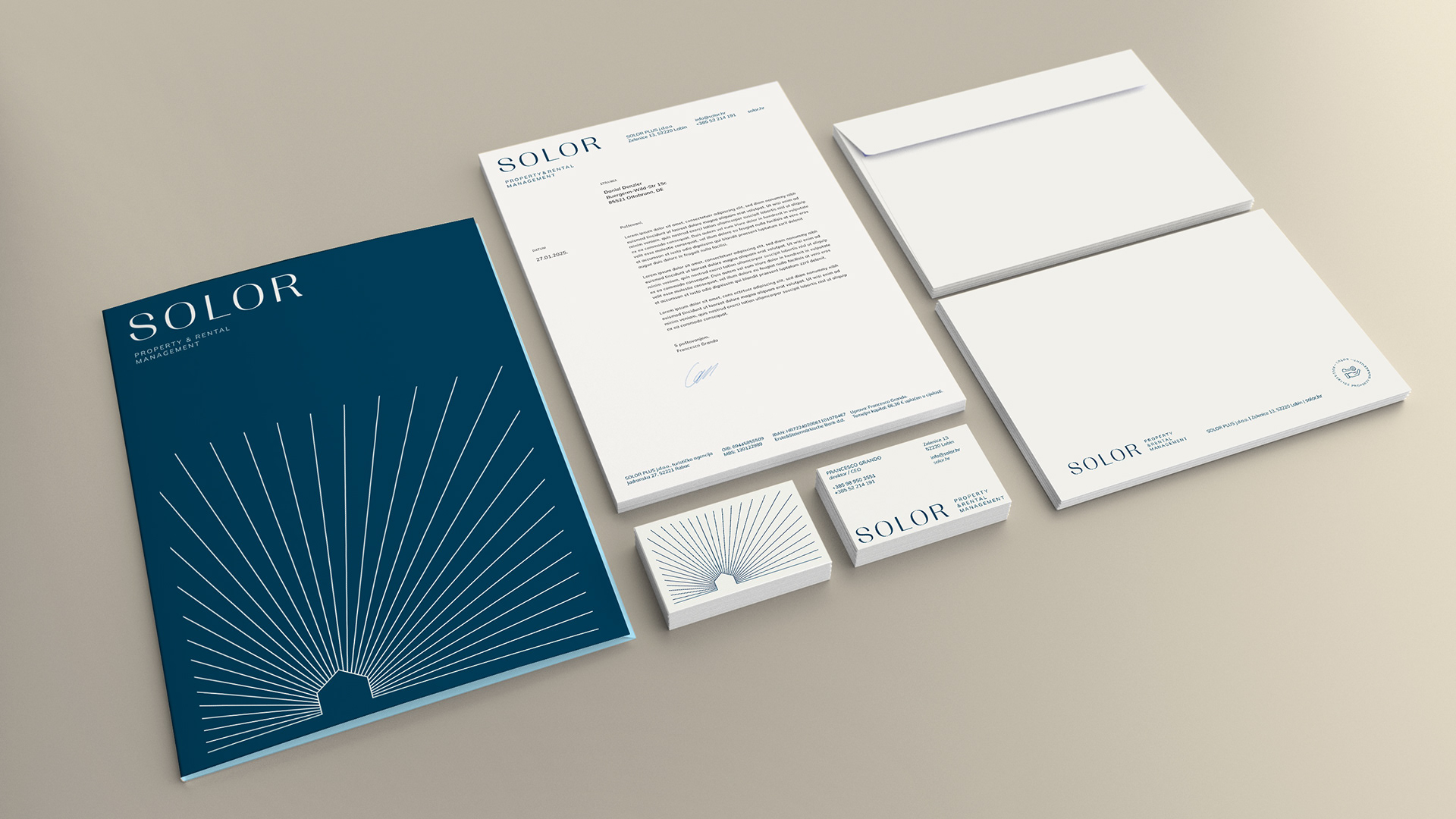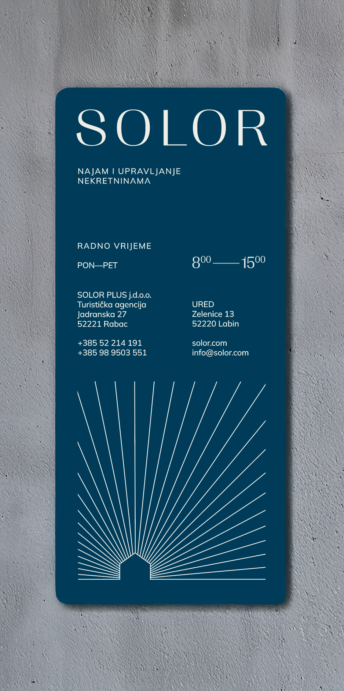 vizualni identitet + brending SOLOR kao full-service agencija za najam i upravljanje luksuznim nekretninama, koja vlasnicima pruža cjelovito rješenje ključ u ruke, dok gostima nudi mnoštvo izbora i besprijekorno iskustvo odmora prilagođeno osobnim potrebama i željama. Strategija komunikacije temelji se na kreativnom i jasnom obraćanju dvjema ključnim publikama – vlasnicima i gostima.